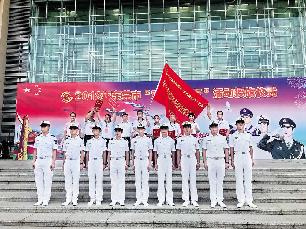 2018年9月5日上午,2018年東莞市“雙百擁軍行”活動授旗儀式在東莞市會議大廈西門廣場舉行?!半p百擁軍行”擁軍團(tuán)代表、駐莞部隊官兵代表等約240人參加活動。
